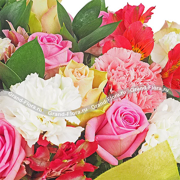 ДЕЛЮКС: роза розовая - 11 шт., роза желтая - 10 шт., гвоздика розовая - 12 шт., гвоздика белая - 12 шт., альстромерия розовая - 4 шт., альстромерия красная - 5 шт., рускус, фетр зеленый, бант розовый.