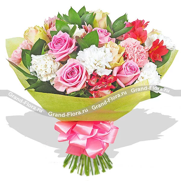 Уменьшенный: роза розовая - 3 шт., роза желтая - 2 шт., гвоздика розовая - 3 шт., гвоздика белая - 3 шт., альстромерия розовая - 1 шт., альстромерия красная - 1 шт., рускус, фетр зеленый, бант розовый.