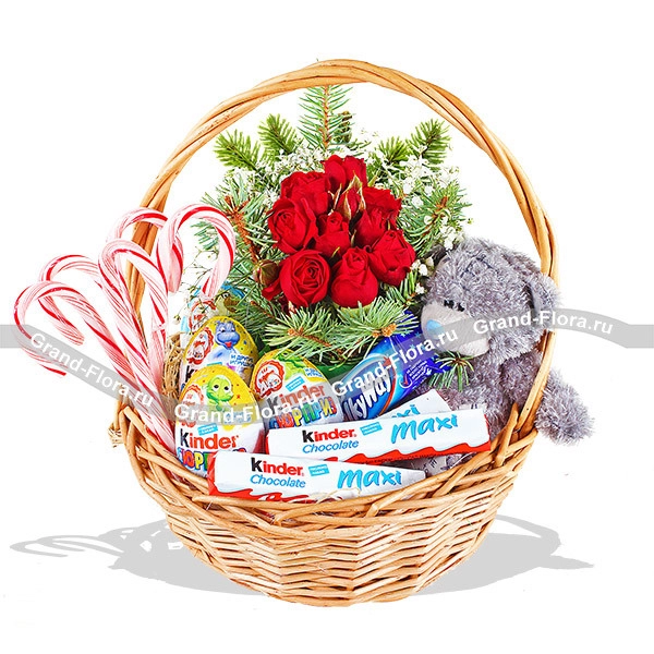 ЛЮКС: роза красная кустовая - 3 шт., гипсофила - 3 шт., еловая ветвь, Мишка Teddy - 20 см, рождественские конфетки - 7 шт., Kinder Сюрприз - 6 шт., Kinder Chocolat max - 6 шт., MilkaWay - 1 шт., оазис, корзина большая.
