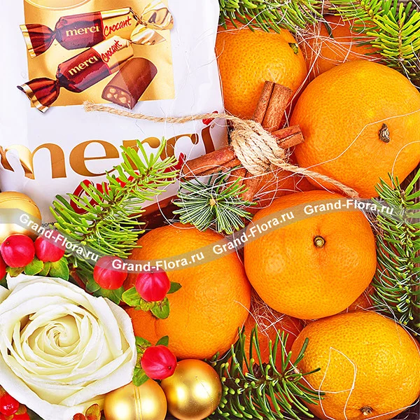 Стандартный (на фото): роза белая - 1шт., гиперикум - 1шт., ель, елочные игрушки -3 шт., корица - 2шт., мандарины - 0,5 кг., конфеты "Merci", коробка.