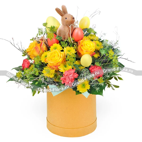 Стандартный: роза желтая - 5 шт., гвоздика коралловая - 6 шт., хризантема кустовая желтая - 4 шт., декоративная зелень, пасхальный декор., оазис, коробка.